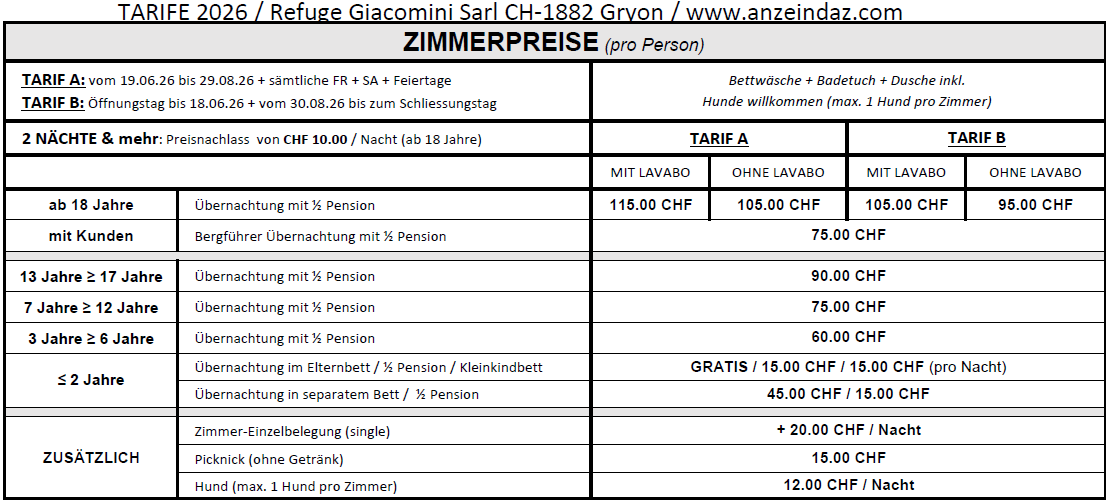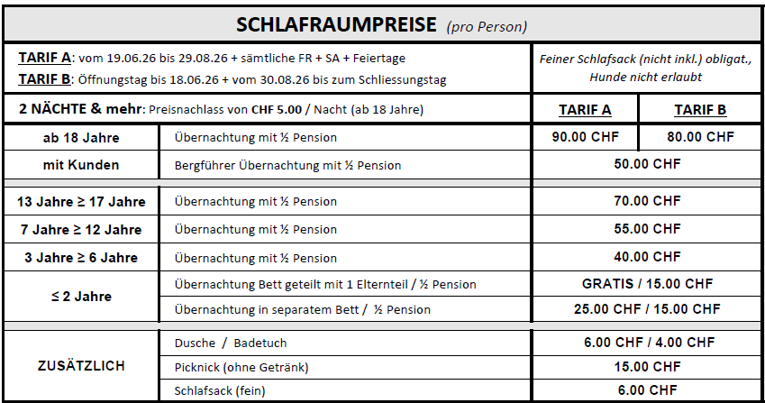 Kurtaxe zusätzlich: CHF 3.-/Tag/p.P. (ab 10 Jahren).